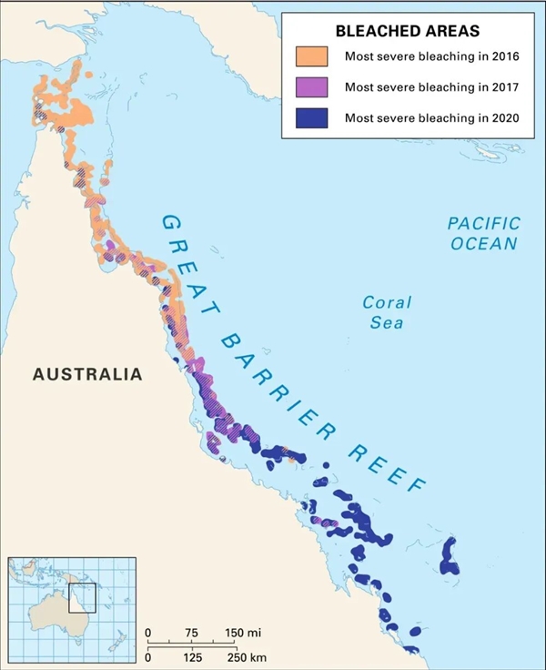 大堡礁正在 2016-2020 年多次海洋热浪影响下的白化危机。图片来历:美国海洋取大气办理局?。