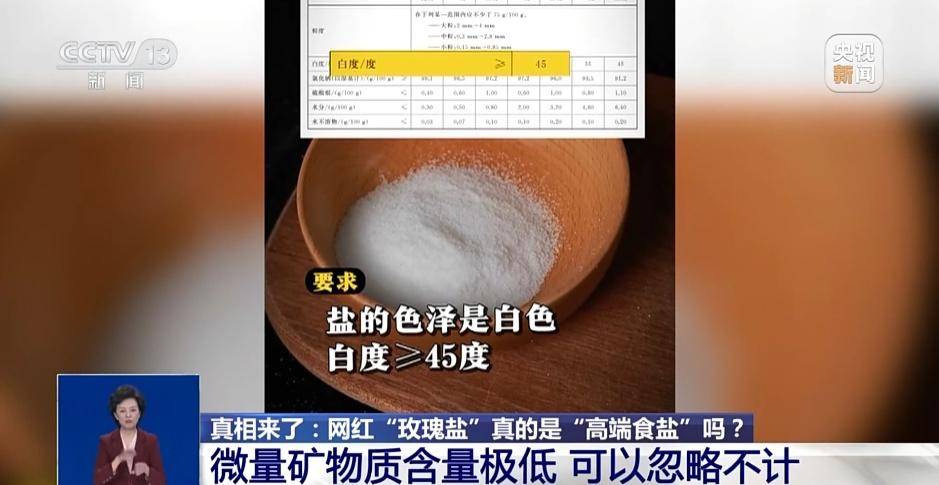 例如,标注“巴基斯坦原产”“喜马拉雅山脉岩盐”的“玫瑰盐”售价约是通俗食盐的6~10倍,个体产物售价以至更高,还有商家宣传其“含84种微量元素”“无添加”“更健康”,奶茶调味的场景化视频,暗示其“既是调料又是养分剂”。对此,工商大学食物取健康学院副传授侯殿志暗示,按照我国相关尺度,食用盐需满脚“色白、味咸、无异味”,白度≥45度这几个前提,可是“玫瑰盐”因天然粉色,单就“色度”一项就不合适我国食用盐的国度尺度。专家还暗示,虽然“玫瑰盐”可能含有多种微量矿物质,但含量极低,通过“玫瑰盐”所能摄入的微量元素量取人体每日所需比拟几乎能够忽略不计。